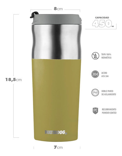 Vaso Térmico Acero Inoxidable Waterdog Olivera 450ccNuestros vasos están construidos íntegramente con acero inoxidable de grado 304. El tipo de acero 304 es capaz de satisfacer una amplia variedad de requisitos físicos por lo que es un material ideal para todos nuestros contenedores ya que no retiene ni transfiere sabores.